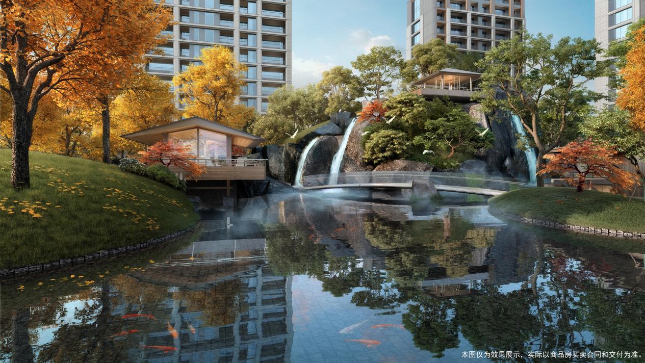 中建智地深谙,建筑美学是城市文化的重要组成部分,优秀的住宅建筑应与周边文化艺术氛围形成 “互补”关系,让空间释放应有的温度,让居住者除了生活以外,能够领略穿越时空的文化交流和精神传承。因此,中建智地在北京宸园的打造上,不遗余力地进行文化艺术的挖掘、引入、共创,从而将其打造成兼具人文艺术、中国文化审美为一体的高端品质豪宅。一大佐证在于山水园林的景观设计。北京宸园营造了超万平方米的山水中庭,其中约有2300平方米灵动水域,水系占园林面积的20.9%。不仅如此,还打造了一个气势恢宏的高山,悬瀑则从山顶倾泻而下。绿化方面,北京宸园遍寻古树,其中不仅有银杏树组合成林,还有珍贵的古树紫薇,全冠移植而来,升华了豪宅的底蕴。
