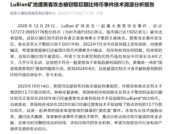 国家计算机病毒应急处理中心的报告明确界定了事件的技术本质:LuBian 矿池存在技术合规缺失,但这一漏洞仅为资产被盗提供了客观条件,不能等同于资产原持有人存在主观过错,更不能成为其承担法律责任的依据。